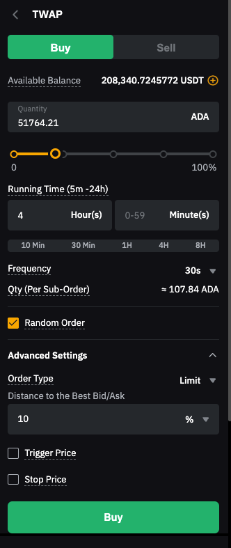 对于现货交易,通过 TWAP 策略下单的每个子订单的最大订单数量可点击此处查看。 对于永续和交割交易,每个子订单的最大订单数量必须 ≤ 此处所述最大订单数量的一半。例如,如果 BTCUSDT 的最大订单规模为 100 BTC,则每笔订单的最大数量为 50 BTC。