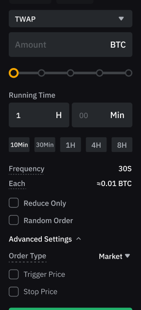每个账户可支持20TWAP策略同时运行,每个交易对最多可开仓十(10)同时实施 TWAP 策略。
