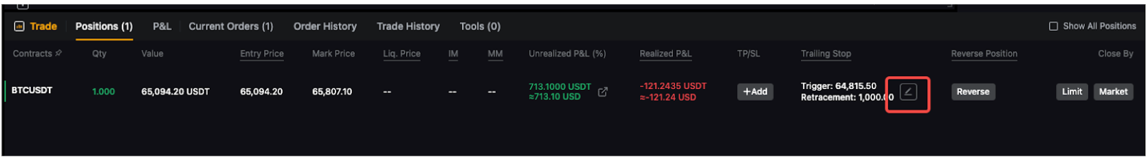 注:如果您持有空头仓位,追踪订单将为市价单,触发价格必须设置为低于仓位的平均入场价格或当前最新成交价格。